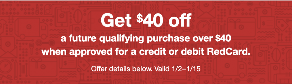 The $40 off $40+ Target RedCard promotion has returned and runs through 1/15. Apply online and you’ll get an account number (write it down) so you can shop while waiting for the plastic card and $40 coupon. Coupon promotion is only available online. Choose either debit or credit card. This promotion is valid only for new accounts; if you haven’t used your card in some time, it might have been closed and you’ll qualify.