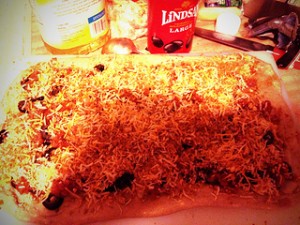 We used to make pizza lots more often than we do today – probably all the cheap and free frozen pizza deals has something to do with it! Decided to make a semi-homemade one using those frozen pizza dough lumps they sell at Dominicks – they’re actually pretty good and a breeze when you decide to make pizza at the last minute. You see the dough, free olives, two small onions sliced, a container of free Wholly Salsa, the Kraft shredded cheese from Ultra for which I spent about 25¢ (oh, you big spender, you!). Was in the mood for a veggie pizza, which pretty much guarantees FirstBorn will not only leave it in peace, but this personal attack on his carnivore lifestyle will give him one more reason to put me in a cheap nursing home. i know my family…