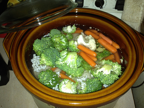 Right now I have two meals going on: The slow cooker is full of rice and an entire package of thighs. I also added one bag of fresh carrots/broccoli. Let it simmer on low all night and you can have a hearty soup or thicken the liquid, place biscuits on top and put in the oven for chicken casserole.
