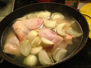 Second meal is a family pack of thighs in a dutch oven on the stove, with water and a couple of onions. This will cook on low until I go up to bed, then be brought out again tomorrow for another hour or two. This should be fall off the bone tender by then, perfect for tacos or quesadillas or chicken salad – – anything that requires tender chicken. Since it takes so long to cook (compared with the finished taco!), I like to make as much chicken as possible and know that we won’t have to turn to that last-minute staple: Frozen Pizza! oh, like your house is any different…