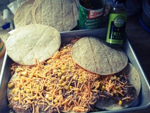 Well, I don’t know what else to call it! That huge pot of chicken thighs I cooked for New Year’s went through a couple of incarnations (tacos, burritos, fajitas) before being frozen. I knew I’d have to come up with something completely different or my family would mutiny. Since I had a couple dozen corn tortillas and lots more Kraft shredded cheese, a germ of an idea was planted – Mexican lasagna!