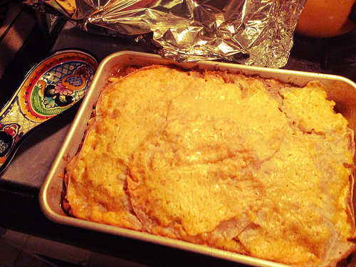 I poured a coating of the cilantro oil on the bottom of the pan and lined it with tortillas, then added the chicken, cheese, corn and tortillas in alternating layers, sprinkling in some of the cilantro oil. Top layer was the shredded cheddar cheese. The cilantro oil came from BlogHer; it’s made from cottonseed oil and it’s good enough for me to buy!