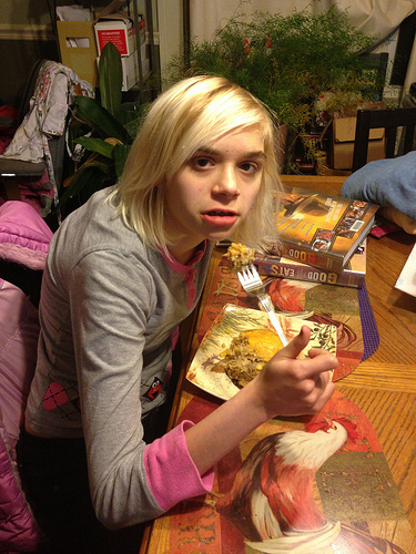 And here’s PITA enjoying her second helping! She’s not thrilled that I interrupted her while eating/reading (she’s working through the Alton Brown series), which explains “The Look.”