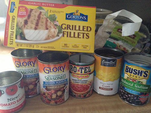 Since I’ve got no energy left (aka too pooped to party syndrome), decided to use up some deal stuff and make my own Mardi Gras dinner. Into the slow cooker went two cans of the tomato & okra blend. Good thing I checked because this is more than half okra, which means a can of Rotel gets added. One can of kernel corn (not traditional, but we like it), one can of tomato sauce (Wags filler), one can of Bush’s black beans (clearance with coupon – – cheap!), one package of sliced chicken sausages, one cubed butterfly pork chop and one small package of fish fillets ($2.39 clearance and I had a $2 coupon). A little bit of oil for mouth feel (pork has zip fat nowadays).
