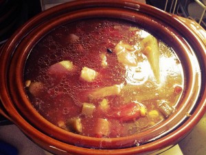 And there you have it! It will cook on its own for the next three or four hours, blending all the flavors together and making the house smell heavenly. Think I’ll serve this over a bed of rice, to absorb the liquid. PITA adores rice, rice, rice…