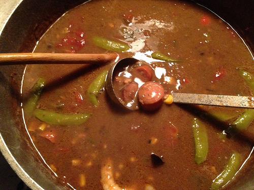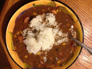 Since I had a *cough* few *cough* containers of the Tangy Jumbo Shrimp left over, I decided to add them to the pot. First thing I needed to do was make a nice dark roux to thicken and add flavor. Then I removed the breading and tails (dogs say thank you) from the shrimp and rinsed them in cold water. Tossed in the bits of red peppers and pea pods from the containers, sliced open another package of chicken sausage, added another can of corn and one of the tomato/okra medley. Lots of Old Bay, little bit of smoked salt and smoked hot paprika later and here’s the final creation – an almost entirely new dish. Serve it in shallow bowls with a scoop of steamed rice on top.