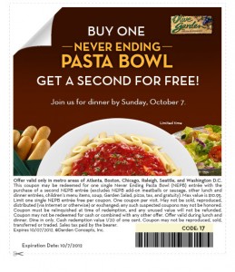 Olive Garden has issued a Buy One Never-ending Pasta Bowl and Get One FREE coupon expiring 10/7, good at select cities: Atlanta, Boston, Chicago, Raleigh, Seattle and Washington, DC.