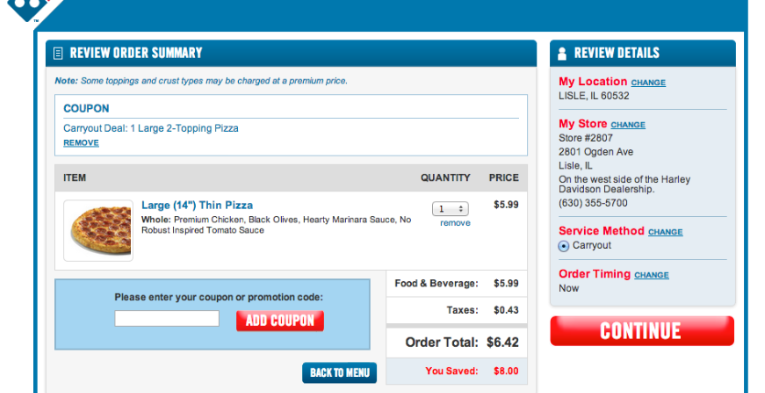 Through the 18th, you can get a large 2-topping Domino pizza for carry-out for $5.99 plus tax in participating areas when you use promo code 9159.