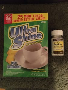 I periodically test Dollar Tree products to compare against grocery and drug store items. A few months ago I tried their powdered dishwasher detergent and was really pleased with how well it worked! So well I put the Cascade back in in the cabinet and picked up another box today, along with the aspirin. On Saturday, DH wanted a pain reliever, so we went to Jewel where he was (well, so was I) shocked at the price of the small bottle of 325 mg generic aspirin – $5.49! Not shown is the two boxes of tissue cubes I made PITA buy herself ’cause I’m tired of her being too lazy to keep a larger & cheaper box in her own room instead of wiping out the pathetic few in those cubes.