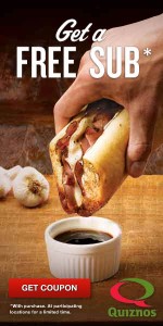 Join the Quiznos Q Club and get coupon offerings via email on a regular basis. Right now they’re showing two: Coupon for a small honey bourbon chicken sub for $2.99 and BOGO coupon for a small sub when you buy a small sub with regular fountain drink.