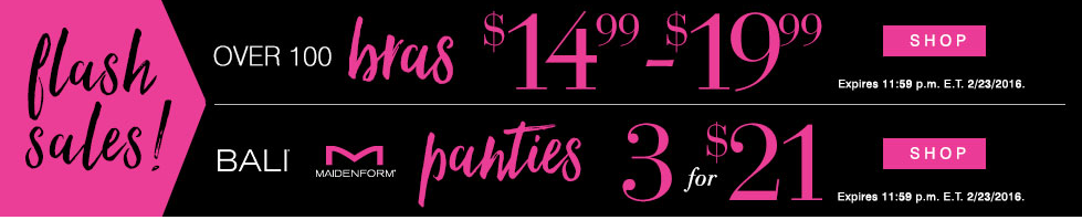 Bra Sale! 50% Off Bali, Playtex, Maidenform and Hanes Ultimate Bras. Flash Bestsellers as low as $14.99. Offer valid 3/1 – 3/2/2016 only.