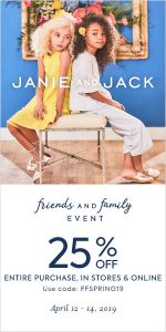 Janie and Jack 25% off sale extended Posted on April 15, 2019 by The Goddess Reply They’ve extended this sale by one day. Check out the Janie and Jack Friends and Family Event: Save 25% off Your Entire Purchase with promo code FFSPRING19. Valid through 4/15. Orders over $100 get free shipping.