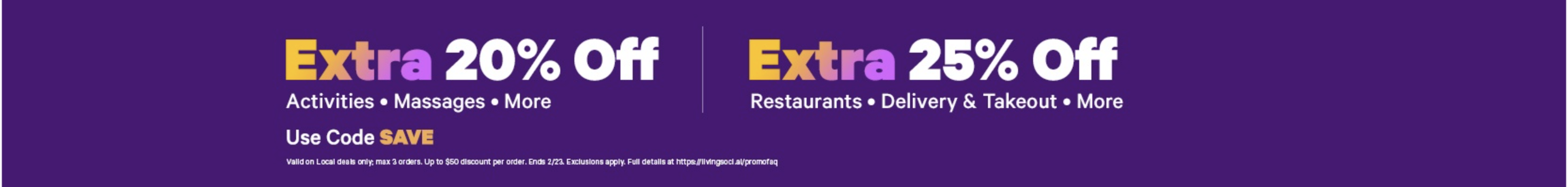 7/9 only, get an extra 20% Off Activities, Beauty, Restaurants and More With Promo Code SAVE. Maximum three orders and up to $1,000 discount per order.