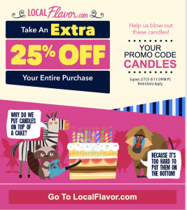 Take an EXTRA 25% at LocalFlavor – 22 states of deals – with promo code CANDLES. Promotion runs through Sunday, February 7th @ 11:59PM PT. 25% comes off your entire cart. Vouchers expire 181 days from date of purchase.