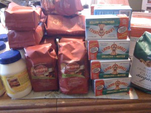 Back from Meijer, where I ran four transactions. The $49.21 might seem high (for a tightwad), but it doesn’t include the four $3 Meijer store cats or the three $1.50 mfr cats [if included, my OOP would be $35.71]. So for the record, here’s what I came home with: 4 SB milk (used $2 coupon and $1.99 rain check; 1 bag sugar; 8 Hellman’s mayo; 12 LOL unsalted butter; 12 Seattle’s Best coffee (mostly organic). I’m content…