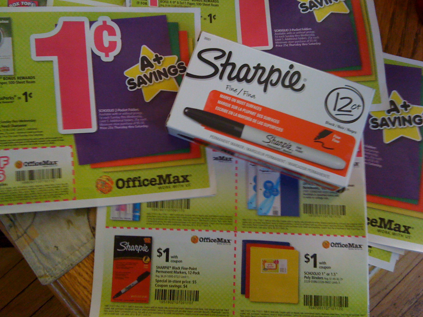 You know you can use competitor’s coupons at Office Depot, Office Max and Staples, right? Well, I used the $4 coupon in the Office Max overleaf page of the weekly ad to get a dozen Sharpies for a buck at Office Depot. Easy peasy, just give ’em the coupon and the buck plus tax. Do this with all the school supplies you know you will be buying: pencils, folders, pens, markers, binders, etc. Pick up a few items every week, and by the time school starts you’ll have picked up all of it (and more to last you the rest of the school year) for slightly more than tax.
