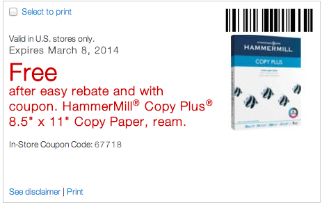 Staples is giving us one free ream of HammerMill® paper this week. I always link to the main coupon page in case you need other items.