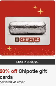 Target is not only offering daily deals like Amazon Prime, it’s also offering limited-time offers (measured in hours), like 20% off Chipotle gift cards right now. Can grab up to $100!