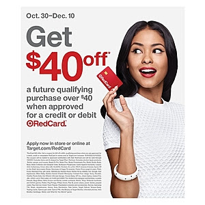 The $40 off $40+ Target RedCard promotion starts today and runs through December 10th. Apply online and you’ll get an immediate account number (write it down) so you can shop while waiting for the plastic card and $40 coupon. Coupon promotion is available online and in store, but then you’d need to get dressed. Choose debit or credit card. Valid for new accounts, but if you haven’t used your card in some time, check the status because Target automatically closes accounts after a period of inactivity.