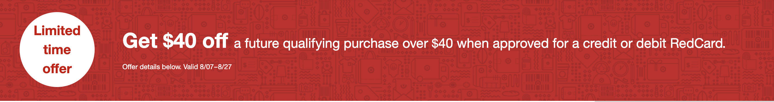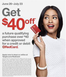 The $40 off $40+ Target RedCard promotion runs through tomorrow, 7/23. Apply online and you’ll get an immediate account number (write it down) so you can shop while waiting for the plastic card and $40 coupon. Coupon promotion is available online and in store, but then you have to get dressed. Choose debit or credit card. Valid for new accounts, but if you haven’t used your card in some time, check the status because Target automatically closes accounts after a period of inactivity.
