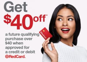 The $40 off $40+ Target RedCard promotion starts today and runs through October 8th. Apply online and get an immediate account number (write it down) so you can shop while waiting for the plastic card and $40 coupon. Coupon promotion is available online and in store, but then you’d need to get dressed. Choose debit or credit card. Valid for new accounts, but if you haven’t used your card in some time, check the status because Target automatically closes accounts after a period of inactivity.