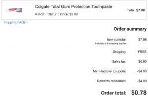This week you can once again score free Colgate toothpaste at Walgreens plus get Free Shipping today only! Here’s my transaction. Once logged into your account, clip the $4/2 coupon and pick up a couple of the $3.99 tubes – pay with Wags cash and earn more (I got $4.03). Since they’re offering Free Shipping with no minimums, no need to go inside to hear crickets.