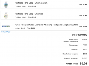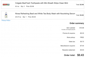 This week you can once again score free Colgate toothpaste at Walgreens, with an additional deal on Nivea body wash or lotion for a buck (big 20 oz sizes). Here’s the transaction I’m picking up later: once logged into your account, clip the $3/2 Colgate and $4 Nivea coupons plus enter FRESH10 under promo code; I earned $3.06 in Wags Rewards ($3 from Colgate). If you click the substitute with same brand you’ll get the deal and maybe even a better one if items aren’t in stock, but not noted.