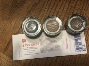 No need for makeup, but if Walgreens is still issuing a $5 Revlon RR when you spend $15 or more on ColorStay products, why not take advantage of those wonderful $5 coupons in 10/6S? Lots of 40% off items (these shadows were $5.39 each) and the liner was clearance priced at $4.79, so my subtotal before coupons was $15.57 plus high tax, which I paid using points. No Register Reward was generated, so they gave me 5,000 points. Either way I spent under a buck and got back $5. Mind you, I made sure they all said ColorStay, ’cause Wags had a lot of other Revlon lines on clearance that weren’t.