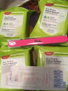 Decided on the way back from my Jewel score that I was gonna pick up some of the Almay makeup wipes while they were still on the B2G1 deal this week and then use the $10 Almay/Revlon OYNO coupon. I figured three would be enough to hit the $10 trigger, but they weirdly rang up at $3.19 each (instead of the $6+ they were earlier in the week!), so after the freebie, I was only at $6.38! Added another pack (all they had) but was 57¢ short, so the cheapest item I could find was this overpriced Revlon nail file for $3.29. I can always use a nail file, but for that price? Total was $3.76 with high tax, used $3 in points and paid the 76 cents in change and got another $10 OYNO coupon good through 9/28 🙂
