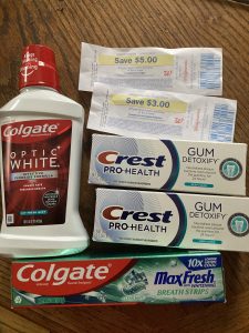 I had read about a $5 Reward for purchases of $1 or more under coupons; turns out I got one, so decided to stop over. Crest Pro-Health Gum Detoxify toothpastes are on clearance, either $4.99 or $5.49, depending on variety, plus they give a $5 RR when you buy two, so into the cart they went (also had $5/2 digital coupon). I actually wanted the Colgate products, each of which had $2 digital coupons; $3 RR for two.