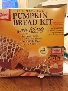 Was at Walgreens, picking up more of the free Enfagrow 4-pks for donating – you mean you haven’t printed out your coupons yet?!, when I saw this Libby’s Pumpkin Bread Kit on a cart – no price on package or shelf – but I knew that Walgreens usually marks down these items shortly before Christmas. Rang up at $1.49 ($5.99 regular) – unfortunately, this was the only box they had.