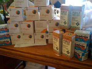 With apologies to MUM, but why would I want to spend money at drugstores? First transaction was for the two Ecotrin for $3. Used my $1.50 coupons, paid 5¢ and got back the $2. Used the $2 RR on my first purchase of tecnu first aid gel to bring the cost down to $5. Then used the $7 tecnu gel RR to buy the Youtheory. and so forth and so on… I also ran a buttload of Ecotrin transactions (buttload being a technical term for large quantities…unless we’re talking about a Depends deal) – didn’t bother with pictures ’cause product castles are so last year…