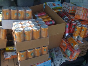 Sorry for the bad pun…well, actually, aren’t puns supposed to be bad? Picked up well over a hundred – stopped counting when we switched from cases to loose cans. Cashier said the orange flavor was awesome, so I just had to try it. She’s right, it’s like drinking cantaloupes! And that’s a good thing!