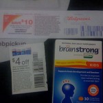 Transaction 3: brainstrong kids vitamin plus Walgreens brand Lansoprozole (generic Prevacid). This is a newer product and may not yet be in stock as of today. WIC is 149338. Use $4 brainstrong coupon plus Goody $2 RR, plus $10 ReNew RR. You will need a very cheap filler for one of the RRs to attach to. Pay filler plus tax. Get back $16 ($10 and $6). Set the $6 RR aside into a pile, ’cause this is your reward for all your hard work!