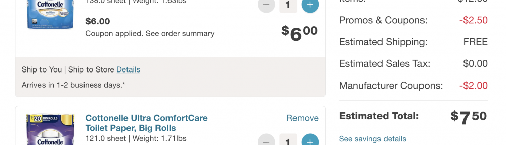 This is the only day to get free shipping at Walgreens and the promo code TAKE25 and both $1 digital coupons, so you’ll end up paying $7.50 plus tax. ’cause you can never have too much toilet paper.