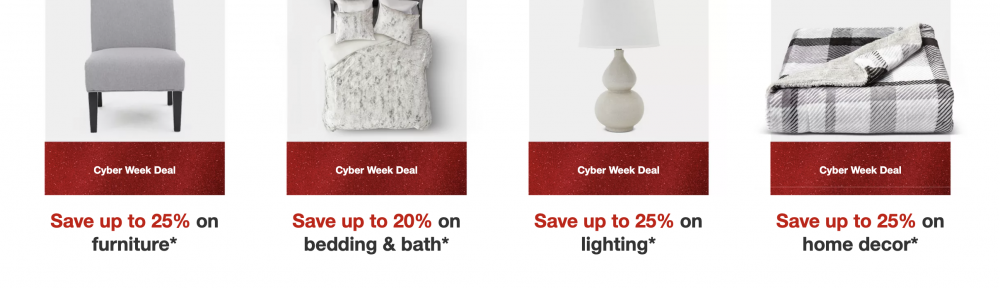Extra Target Savings during Cyber Week Posted on December 2, 2020 by The Goddess The savings are actually greater than what the banner reads plus Holiday Deals save an extra $10 on each $50 purchase of lights, trees, etc. Target Circle members have additional savings (minimum of 10% with some reporting higher amounts).