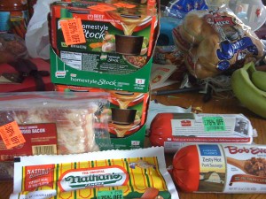 Dominicks:  This is Rachel’s store, so she knows which cashier to pick and who to avoid (well, how else would you phrase it?).  Clearance section first, for the Knorr homestyle stock, which is marked 50% off $3.99.  Since 9/11 RP has a $2 coupon, the seventeen packs on the shelve jump into my cart.  Clearance meat section looms.  Rachel says lately they’ve only had green meat.  Two full section of Purdue whole chickens and drumsticks and steaks.  Find applewood bacon (1.5 lb pgk) at 50% off, Bob Evan sausage and Nathan’s franks for 75% off.  Two packs of bacon – I took one.  We walk along the meat and Rachel comments that the bacon is on sale for $7.99 but the 50% will be on the $10.99 regular price.  I don’t complain, since it’s still a good price.