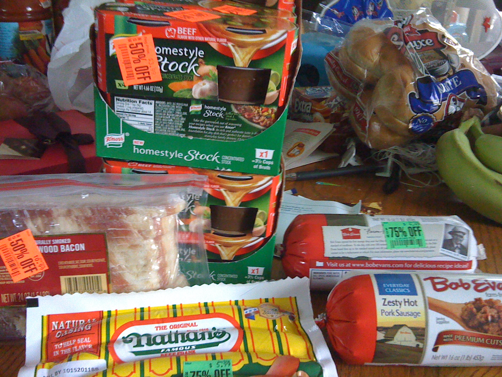 Head up to checkout.  I go to closest one that is empty.  Rachel says no, that cashier will scan every coupon, hold it up to her glasses, every friggin’ one.  Long lines at the other registers, so I’ll chance it.  While I’m checking out, Rachel decides to run back and get the other bacon.  You guessed it:  GONE!  Comes back up and I’m almost completely finished.  Cashier was super nice, scanned each coupon quickly and efficiently, my bacon was 50% off the sale price and I ended up paying $3.96.  Immediately Rachel starts shaking like a dog with distemper.  “let me see that receipt, that’s not right, the bacon alone was $4” as we’re crossing the parking lot.  So, we both look at the receipt;  odd-looking, the way it groups items, but as long as it’s in my favor, I don’t care.