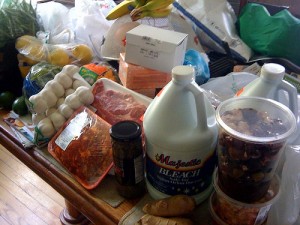 You see here a large package of al pastor meat mix for eggs, etc., the shrimp and crab cocktails (two), the large olive bar indiscretion, bananas (sign said product of US – really?), three garlic baggies since they were only .78 each, fresh green beans (seriously, the cashier did not know what they were…thought they were pea pods), orange and green cauliflower heads, limes, incredibly cheap ginger root, globe red grapes, some “grilling steaks?” and probably other stuff that I forgot about…total came to $63.12 ouch. without coupons…double ouch.