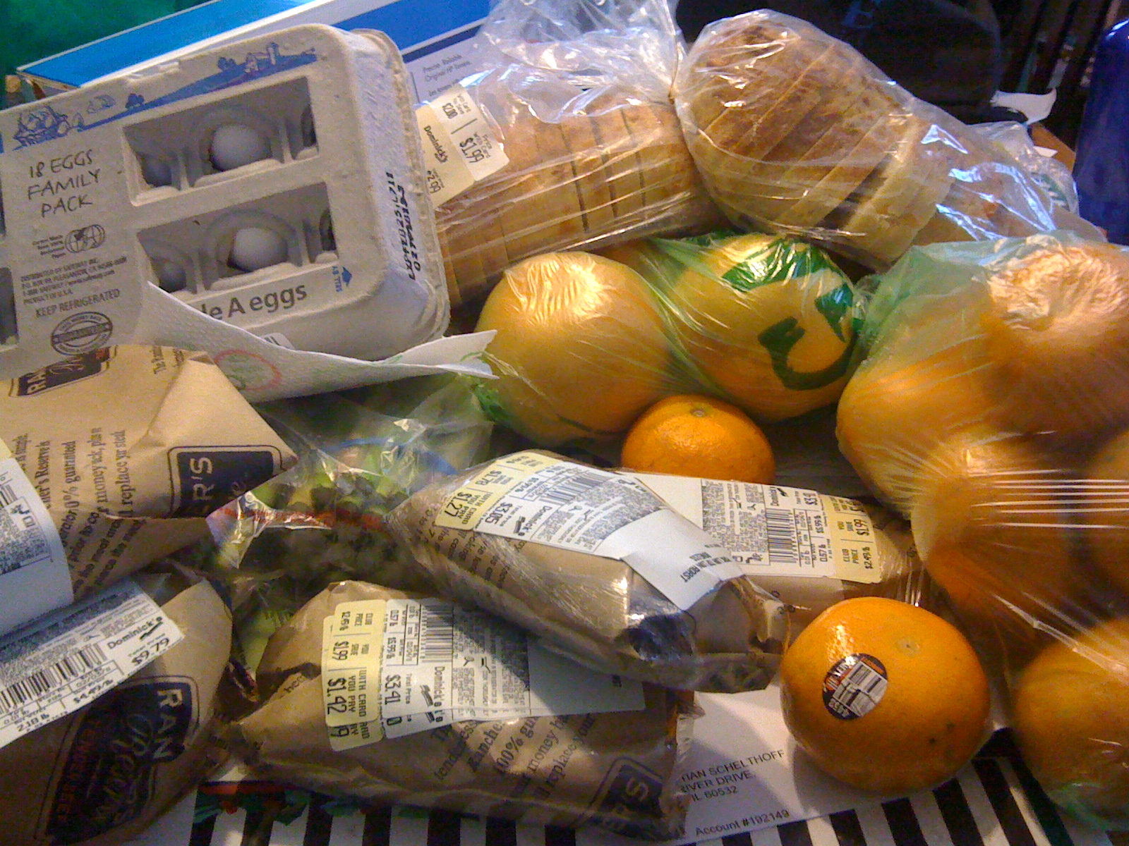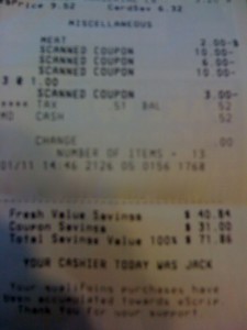 today only promo of a free sandwich when you say the secret phrase: Chick-fil-A rocks my socks…. shudder… the things I do for free. After that, decided to check out the grapefruit sale at Dominicks (3 lbs/$1); hoped I’d get maybe ONE coupon booklet…so not only is there a sale on the ruby red grapefruit, the honey tangerines are 2 lbs/$1! This is a great deal, especially since my aborted trip to Ultra shithole included a very small bag of these for $1.39 lb. So here’s what I ended up with, besides the two sets of coupon books pictured: 1 RR cube steak for $2.58 ($2 RR q); 2 Horizon organic puny milks ($1/1 ip); 2 quarts Lucerne clearance creamer; New York Style bagel chips ($3.99/1 ip); almost 5 pounds each of the tangerines and grapefruit. Total was $9.77 and I used an expired $6 RR to get down to 3.77 – sweet, pun intended.