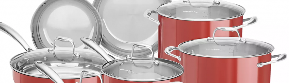 Target has this red 14 piece KitchenAid cookware set with glass lids (originally $300) on clearance for only $119.99 or less with REDcard. Set includes one 8-inch skillet, one 10-inch skillet, three saucepans of varying sizes, one 3.5-quart sauté pan, one 6-quart casserole and an 8-quart stockpot. Every piece except the two skillets comes with a glass lid
