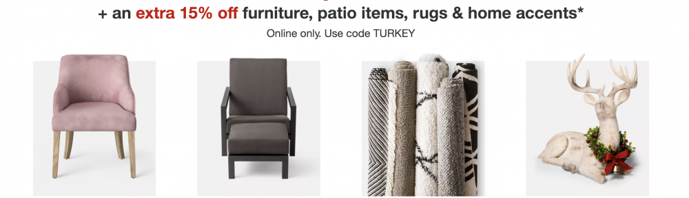Target: up to 50% + extra 15% today Posted on November 30, 2019 by The Goddess Last day to take advantage of Target’s Home Sale: up to 40% off most home furnishings and then add promo code TURKEY for an extra 15% off! Use REDcard for another 5% discount. Up to 50% off small kitchen appliances and you can use the same code!