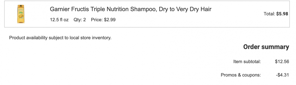 Not like I really need more shampoo, but for this price, I’m in. Garnier has a couple of online mfr coupons at Walgreens which you can combine with their own coupon plus an extra 20% discount for using Store Pickup (Code QUICK20). Since we go through so much shampoo and body wash in this house – why not? You’ll see the $4/2 Whole Blends, $3/2 Garnier Fructis and a $1 My Final Price extra for whatever. Use the code for 20% off and this is what I’ll supposedly get – all in stock and paid for. Already got the ready for pickup email.